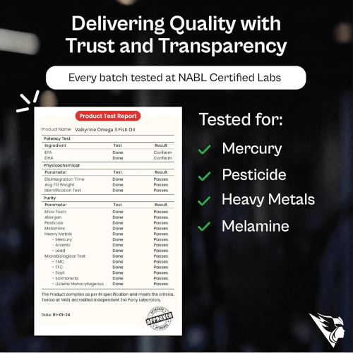 Valkyrine Omega 3 Fish Oil is a premium supplement crafted to support your heart, brain, eyes, and joint health naturally. Each softgel is enriched with high-potency EPA and DHA, the two essential Omega-3 fatty acids your body needs for optimal performance. Sourced from deep-sea fish and purified using advanced molecular distillation, Valkyrine ensures maximum purity and freshness — free from heavy metals and toxins.The Omega 3 Advantage
